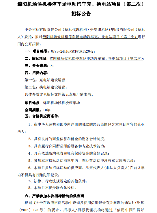 綿陽機場候機樓停車場電動汽車充、換電站項目(第二次)招標(biāo)公告