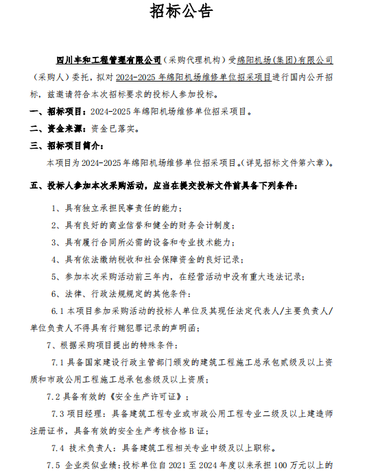 2024-2025年綿陽機(jī)場維修單位招采項目招標(biāo)公告